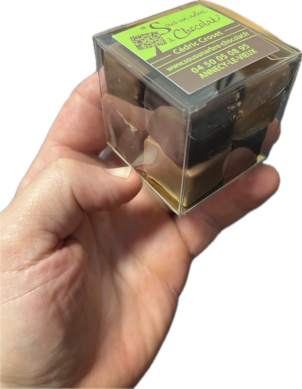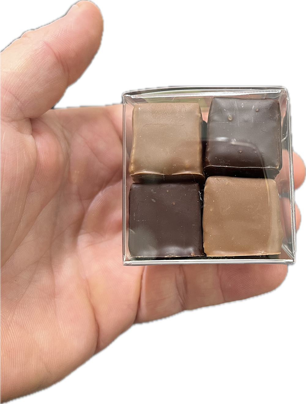 Un cube de gianduja noisettes dans lequel est emprisonné une délicieuse noisette grillée caramélisée puis enrobé de chocolat lait et noir.
