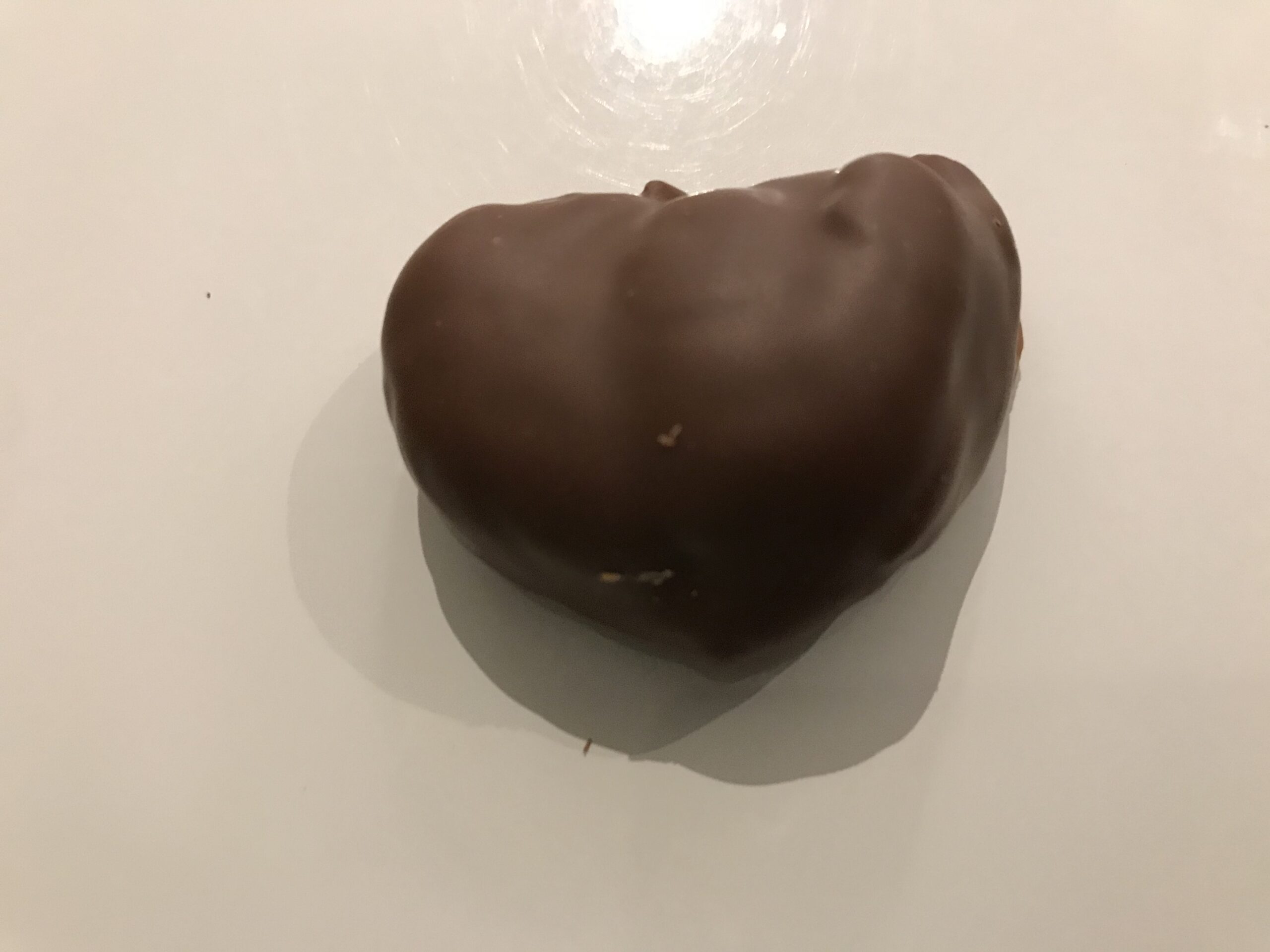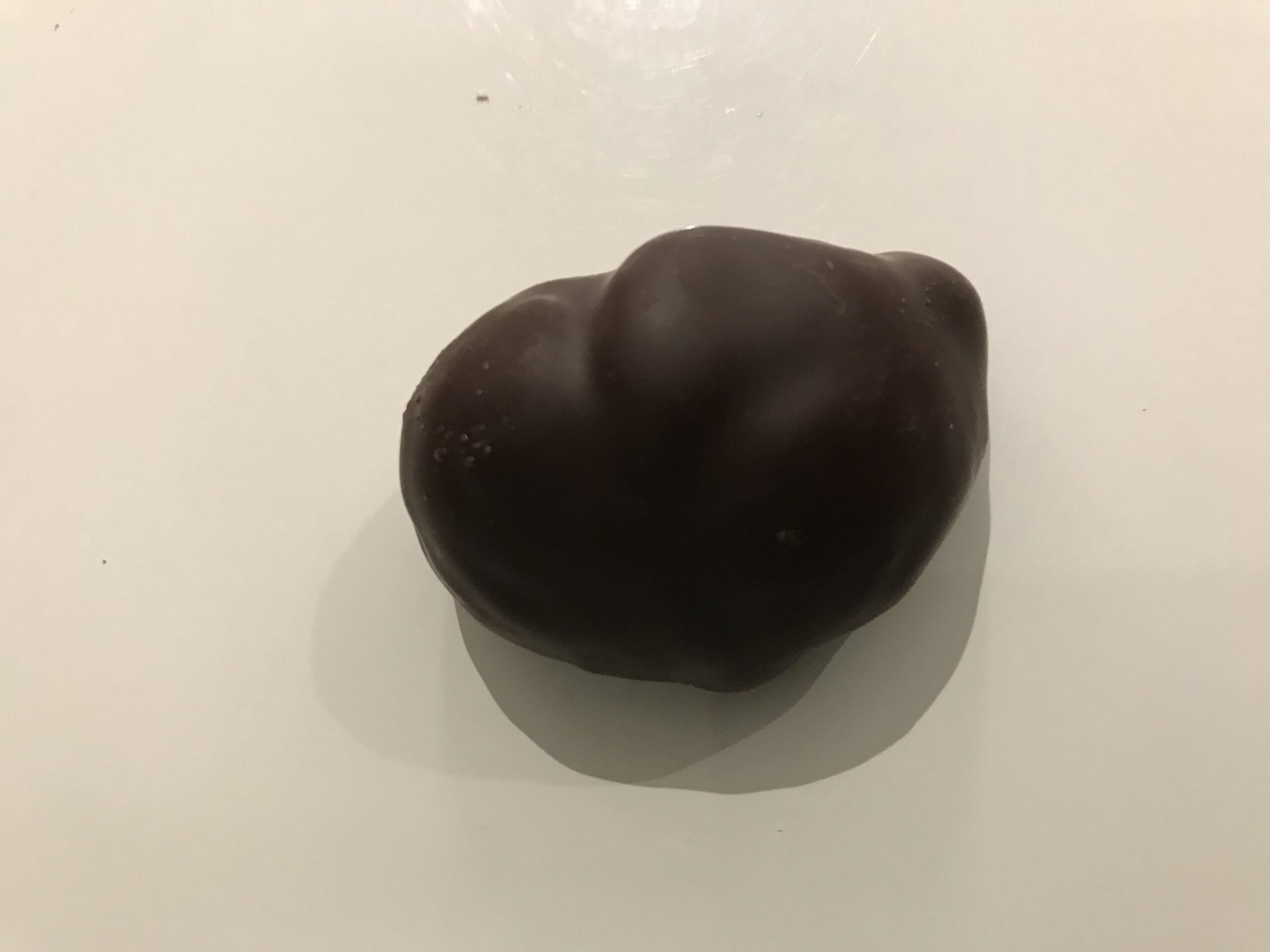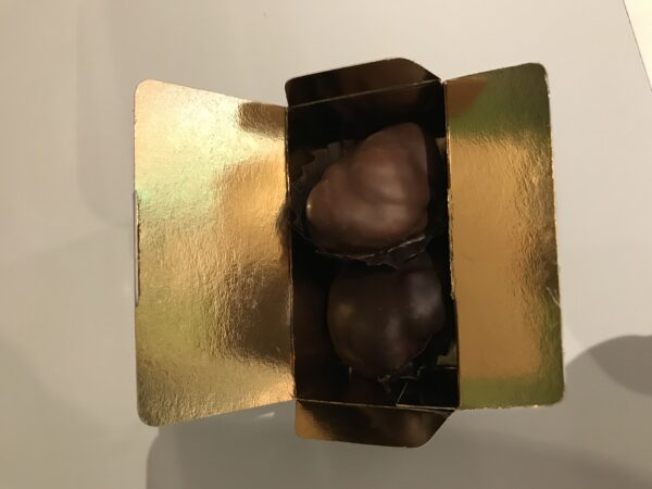 Marrons confits enrobés de chocolat, un lait et un noir. Vendu par deux.