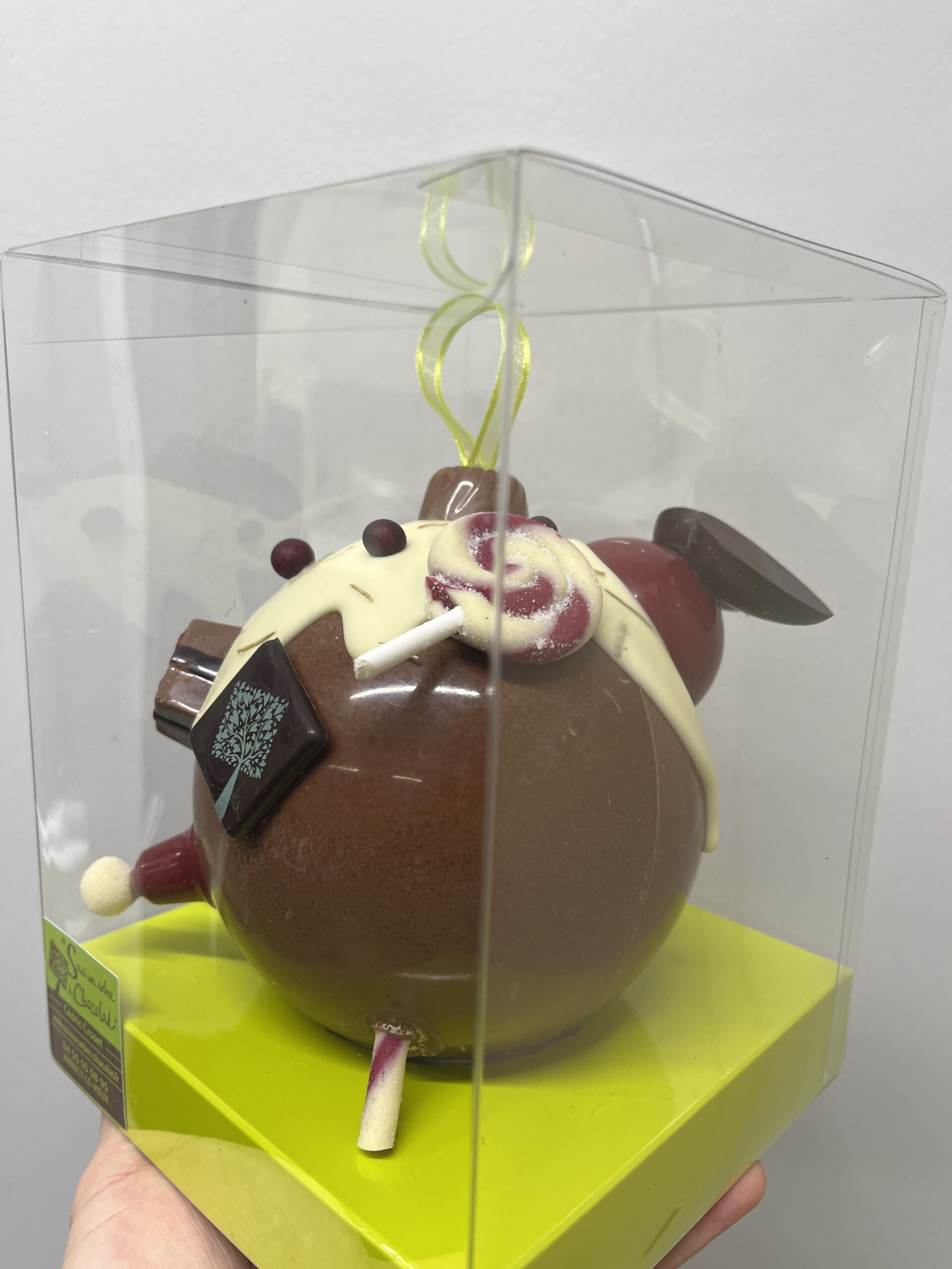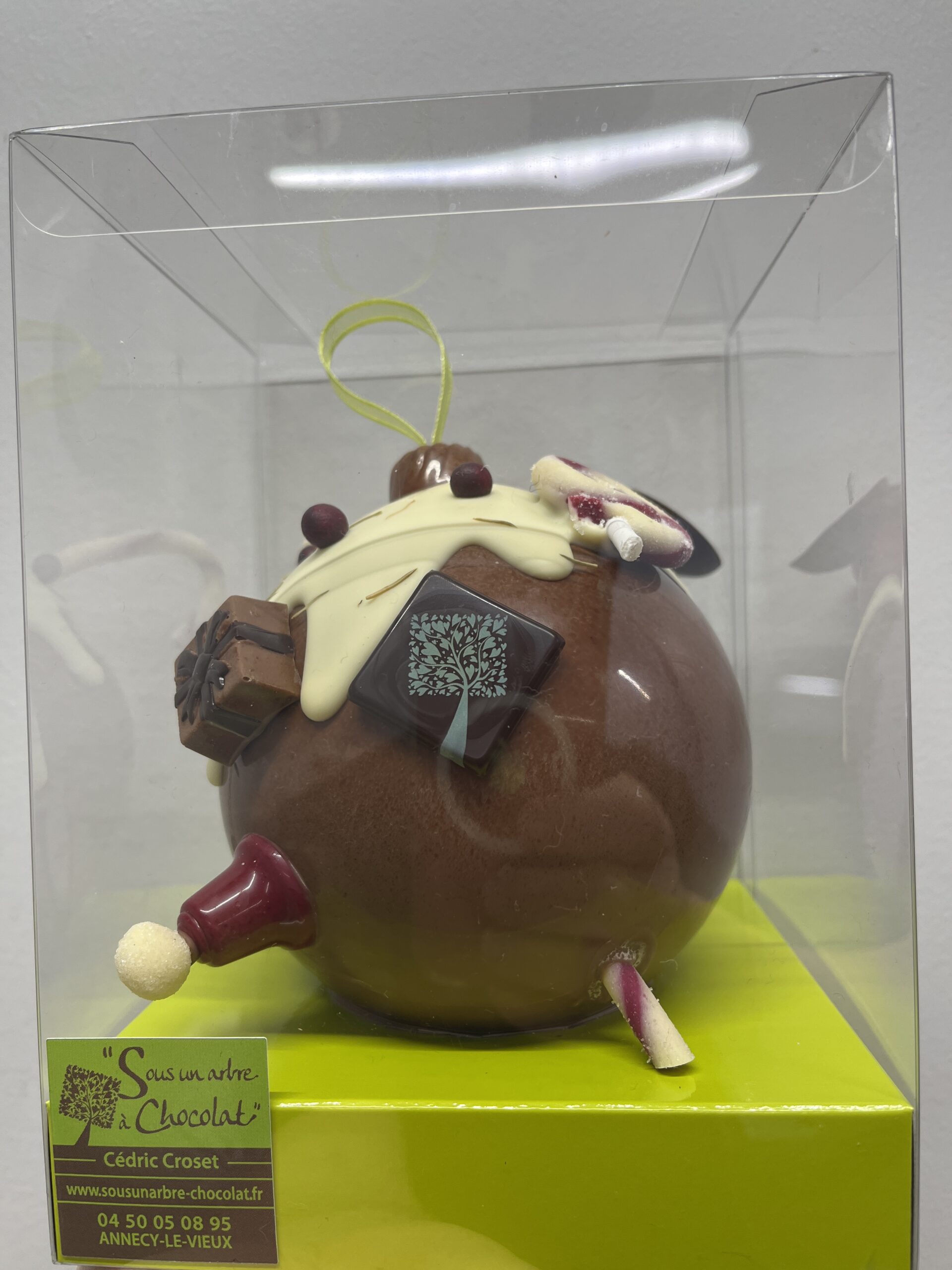 Panique à Noël, montage chocolat lait ,garni de noisettes, amandes et riz soufflé caramélisés enrobés de chocolat.